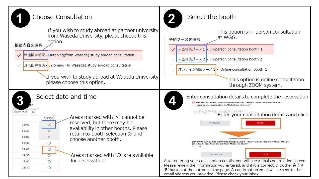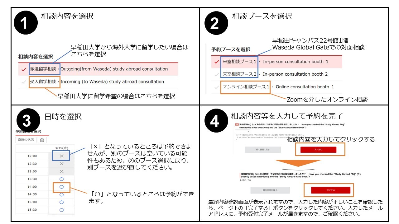 ・Each person can book only one slot per day, and each consultation session lasts for 20 minutes. To make the best use of your time, please review the "Study Abroad Guidebook", and "Study Abroad FAQ" in advance and prepare your questions accordingly.